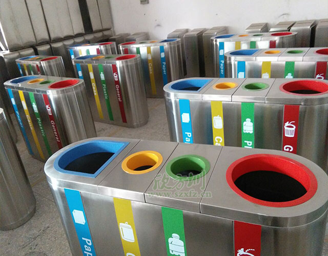 • 產(chǎn)品材質(zhì):欣方圳商場精品不銹鋼四分類垃圾桶采用新型的剪鈑下料,折彎、沖壓、焊接、打磨、等工藝: 表面經(jīng)過除油、噴砂防銹處理后,再進行酸洗磷化處理;表面清理干燥后整體進行靜電噴涂,涂層厚度達到 90um,經(jīng)過流水線高溫固化爐固化后再出爐冷卻,加工后的塑粉附著力強,不易剝落;