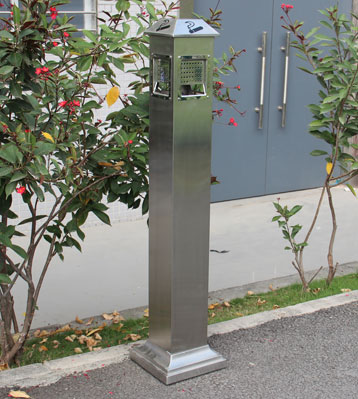 戶外公共場(chǎng)所不銹鋼滅煙柱采用優(yōu)質(zhì)不銹鋼材質(zhì)制作,方形底座配重不傾倒,長(zhǎng)期擺放戶外高檔不生銹,用于吸煙人群滅煙和煙蒂收集使用,防范火災(zāi)隱患。