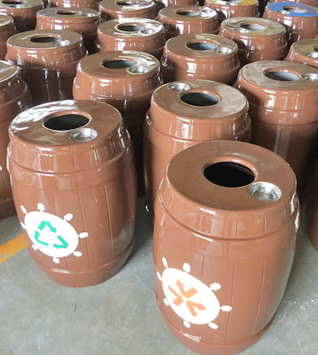 景區(qū)玻璃鋼仿木桶組合分類垃圾桶廠家批量生產(chǎn)圖