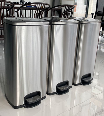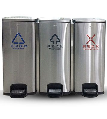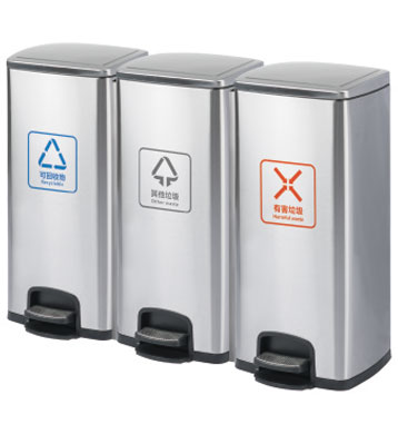 • 產(chǎn)品名稱:90L家用室內(nèi)不銹鋼腳踏三分類垃圾桶